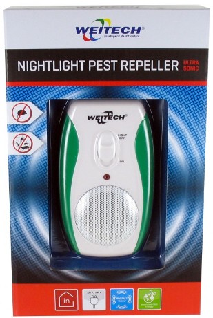 Ультразвуковой отпугиватель "Weitech WK 0190" эффективен против грызунов (мыши, хомяки) и насекомых (тараканы, пауки, муравьи и др.). Способен защитить от вредителей жилое помещение, гараж, чердак или другой объект площадью до 90 кв. м. Имеет функцию подсветки.